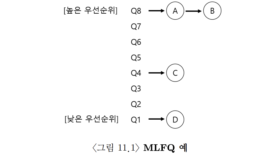 - 서로 다른 우선순위를 가진 여러개의 큐로 구성됨