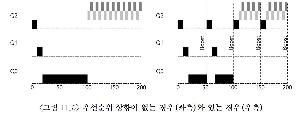 - 타임 슬라이스의 99%까지 실행하고 아무 파일 대상으로 입출력 요청을 한다면 우선순위가 내려가지 않아 CPU를 독점할 가능성도 생긴다.