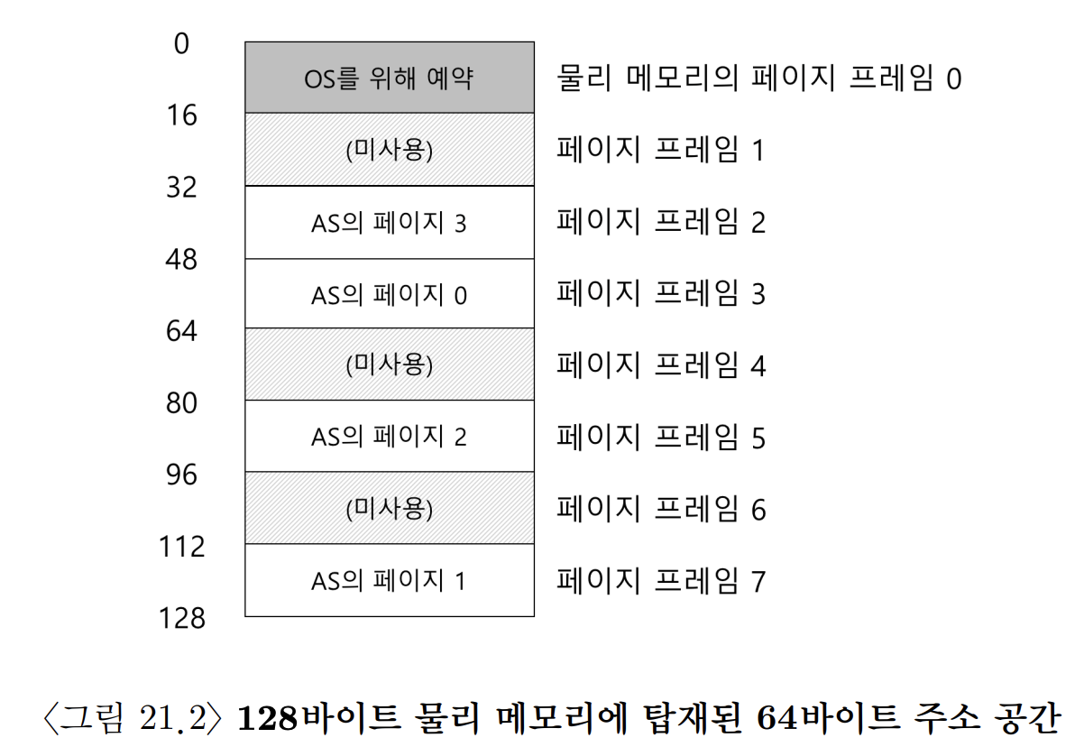 위의 그림과 같이 64바이트의 작은 주소 공간을 16바이트짜리 페이지 4개로 나눌수 있고 이를 물리 메모리의 페이지 프레임에 탑재 한것을 볼 수 있다.(물리 메모리의 페이지 프레임 또한 16바이트)