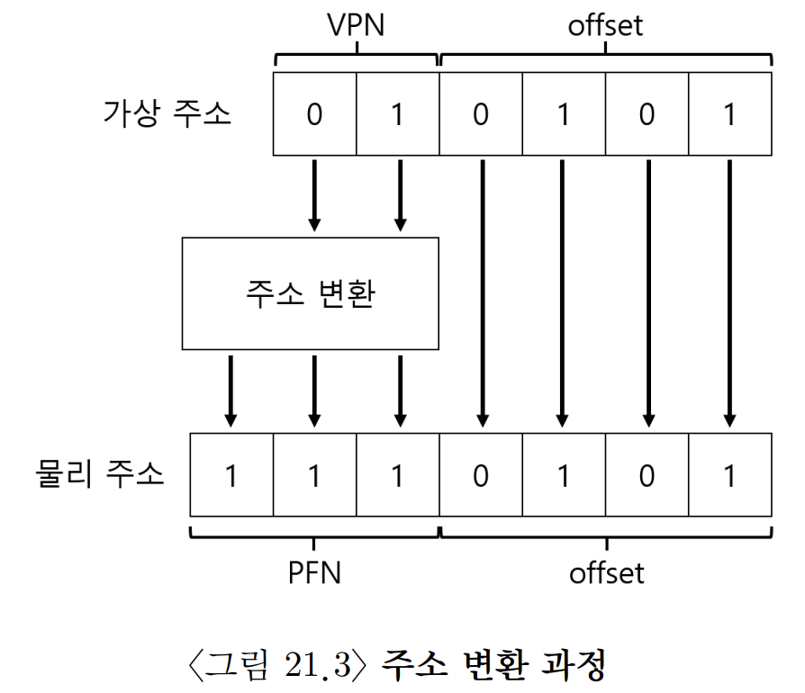 주소 변환을 위해 먼저 가상 주소를 가상페이지 번호(virtual page number, VPN)와 페이지내에서의 오프셋(OFFSET)으로 나눈다.